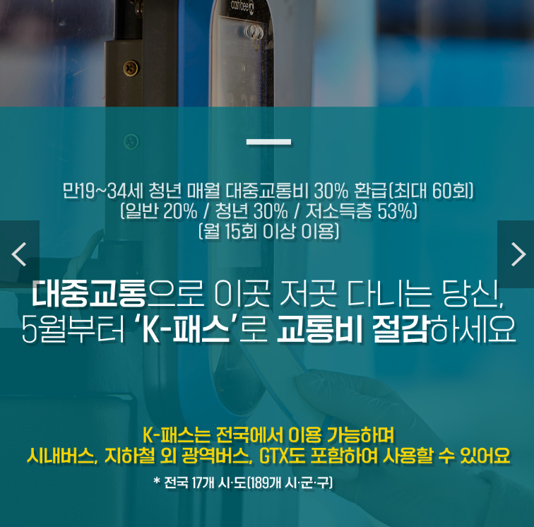 ● K-패스는 월 15회 이상 대중교통을 정기적으로 이용할 경우, 지출금액의 일정비율(일반인 20%, 청년층 30%, 저소득층 53%)을 다음 달에 환급받을 수 있는 교통카드입니다.