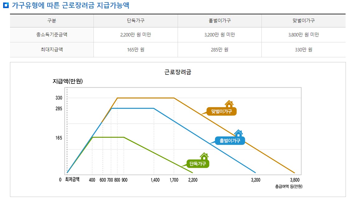 근로장려금은 가구원 구성에 따라 정한 부부합산 총급여액 등을 기준으로 지급액을 산정합니다.