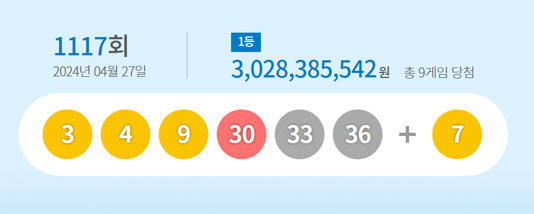 로또복권 운영사 동행복권은 27일 제1117회 로또 추첨 결과 ‘3, 4, 9, 30, 33, 36’이 1등 당첨 번호로 뽑혔다고 밝혔다.