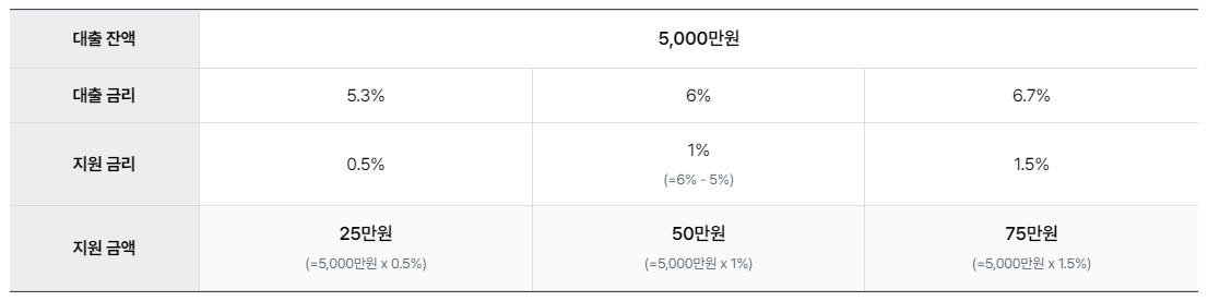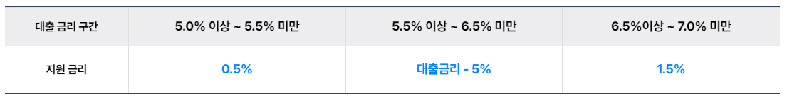 ● 이자지원이 가능한 대출액은 최대 1억 원으로 한정지원금액은 대출잔액 X 해당 대출금리구간 지원 이자율