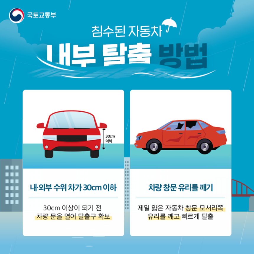 ● 따라서 빠르게 탈출해야 하며, 내부 수위가 높아 문을 열기 어려운 경우 창문 유리를 깨고 탈출하는 것도 방법입니다.