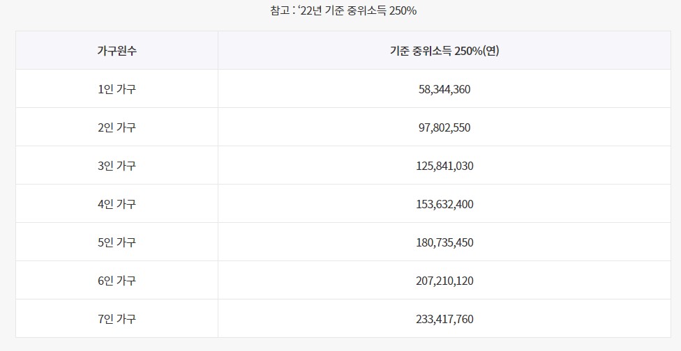 가구원 수에 따른 기준 중위소득 250% 이하에 해당하는 자