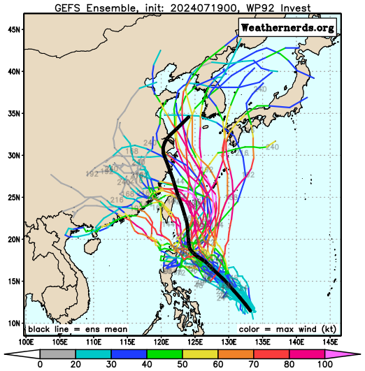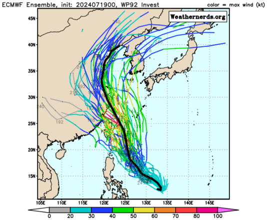 또한, 유럽 중기예보센터(ECMWF)의 앙상블 모델은 중국 동부 해안을 따라 더 북쪽으로 이동해 산둥 반도를 거치고 북한 서해상으로 나갈 것으로 분석하고 있지요.